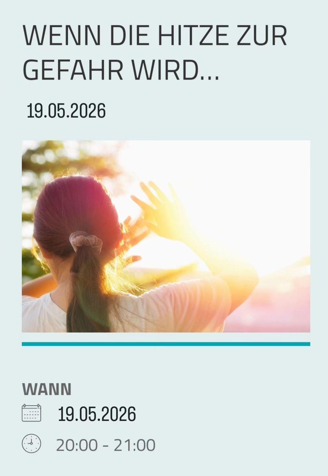 - Lebensgefahr Hitze - was ist wichtig und wie bleiben wir gesund? Dienstag 12.05.26, 18:00 Uhr